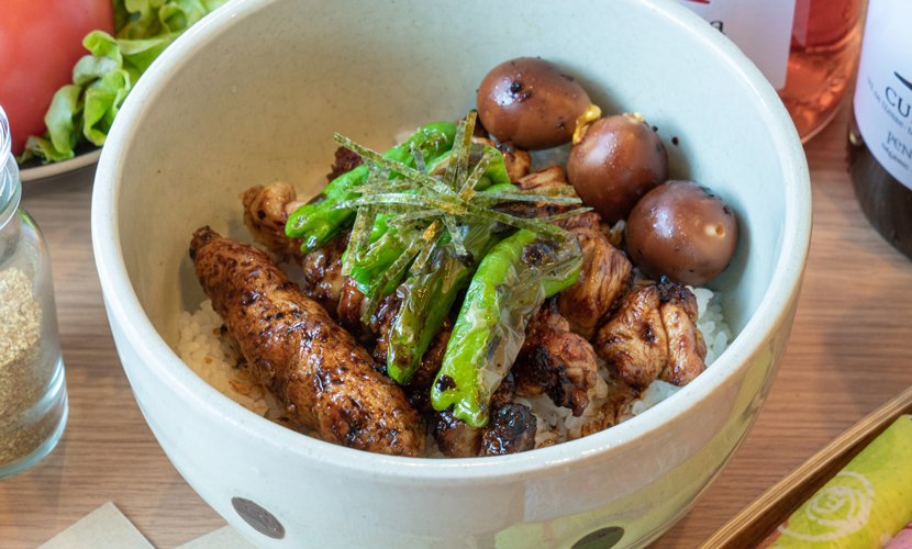 国産の焼き鳥などを6種をのせた彩り弁当★ねぎみ・つくね・かわ・せせり・うずらたまご・ししとうが各1本入っています。